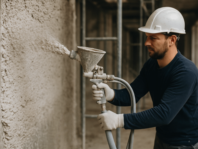 Mortier prêt à l’emploi pour application mécanique, idéal pour les chantiers à fort rendement.